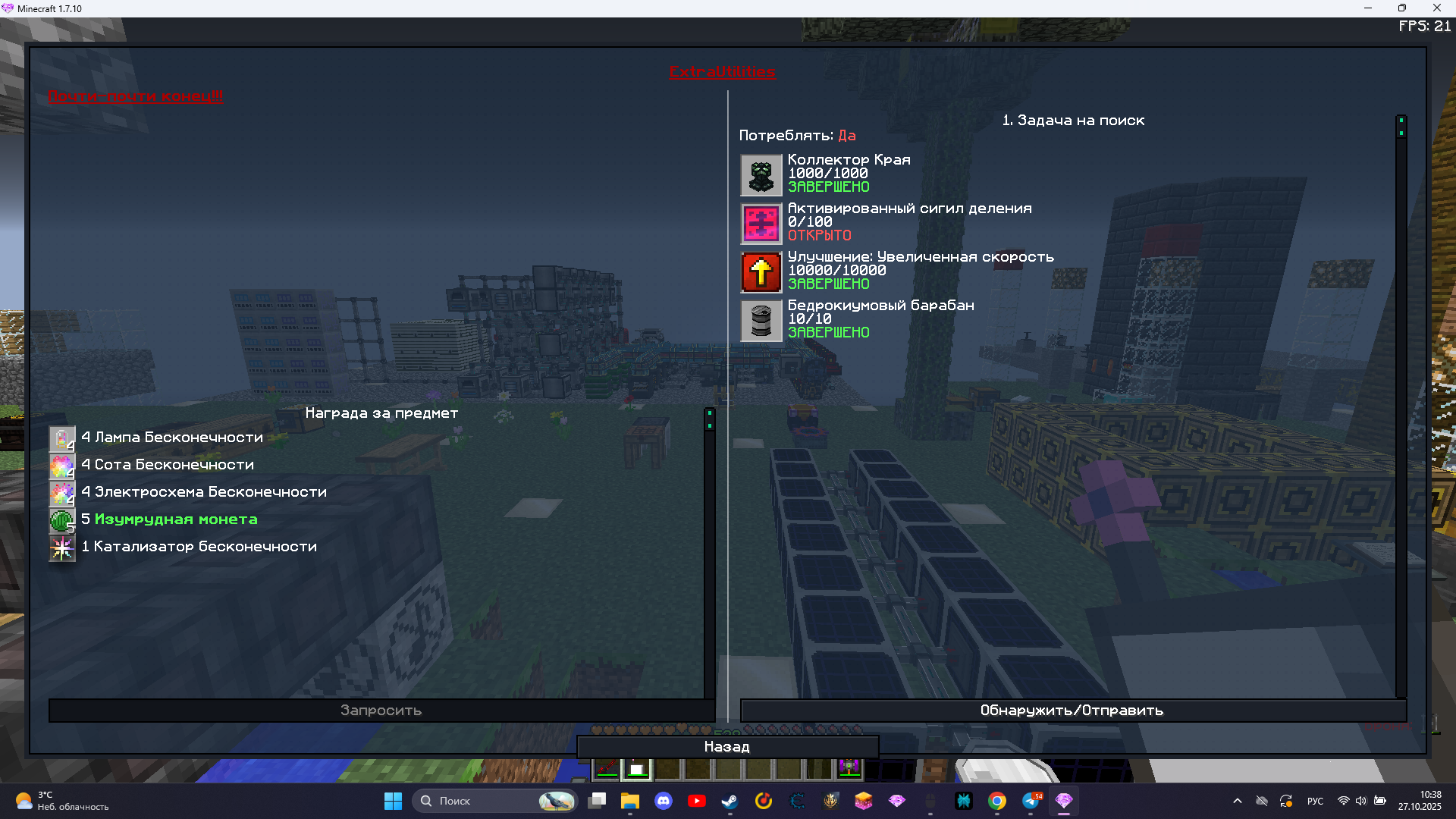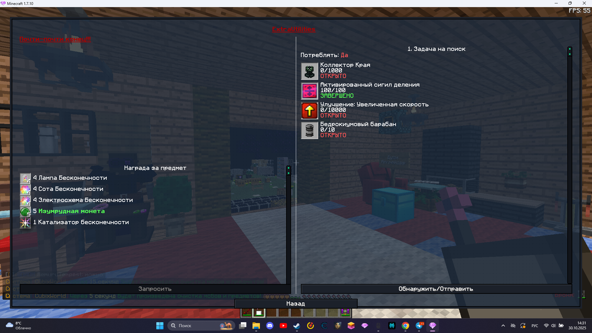 - Описание ситуации: вчера сдал в квест 1.000 коллекторов края, 10.000 Улучшение: Увеличенная скорость и 10 Бедрокиумовых барабонов, сегодня начал сдавать 100 активированных сигилов, и всё остальное откатило