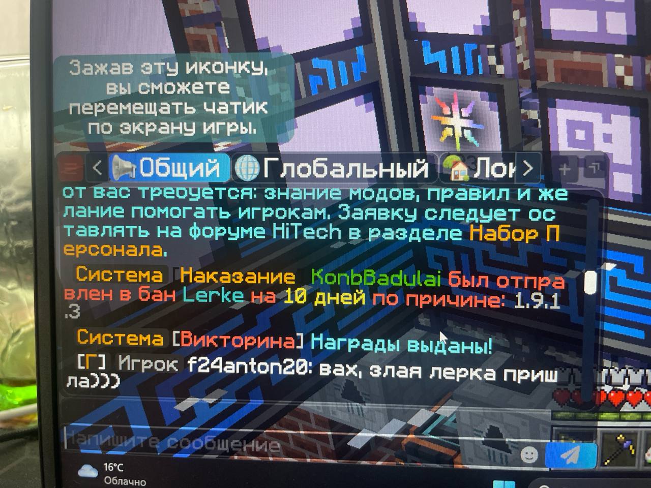 - Описание ситуации:Абсолютно предвзятое отношение ко мне и всем кто со мной играет. Выдаёт мне бан за 1.9.1.0 сегодня в 12-09 без каких либо на то причин. Играю с другом, никого не трогаю и тут мне друг скидывает что я забанен. На меня не было никаких жалоб или ещё чего либо. Она все время придирается к тому что у меня много ресурсов. Это разве запрещено иметь много ресурсов?