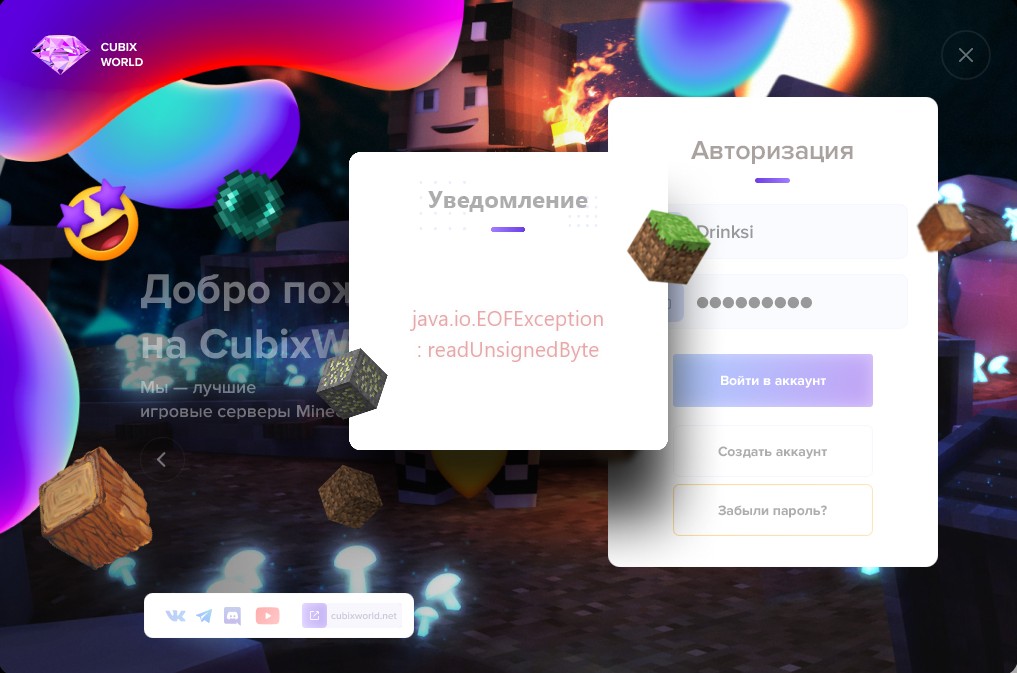 - Описание ситуации: Не заходит в игру. Причиной ошибки является java.io.EOFExceptoin: readUnsignedByte. Не понятная для меня причина. Так как я ничего не менял, в коде не рылся. Вышел и не смог зайти назад. Подскажите что это такое, у моего друга идентичная причина. Джаву пробовал обновлять и перескачивать, не помогло ни одно, ни второе. С лаунчером идентичная ситуация.