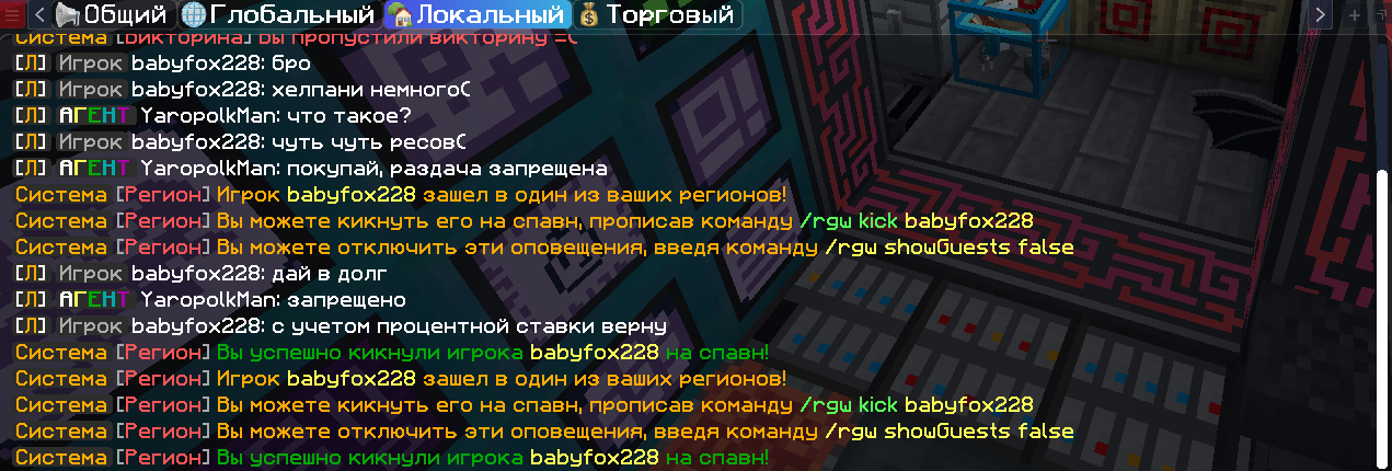 - Гражданин babyfox228 используя команду "/tpa", проник в мое жилище (с моего согласия с использованием команды "/tp accept"), в дальнейшем пытался безвозмездно получить мною нажитое имущество, не конкретизируя, что конкретно, прошу Вас оказать содействие а данном инциденте и строго указать гражданину babyfox228, так-же прошу Вас обратить внимание на имя данного гражданина, которое цифрами указывает на одноименную статью уголовного кодекса Российской Федерации.