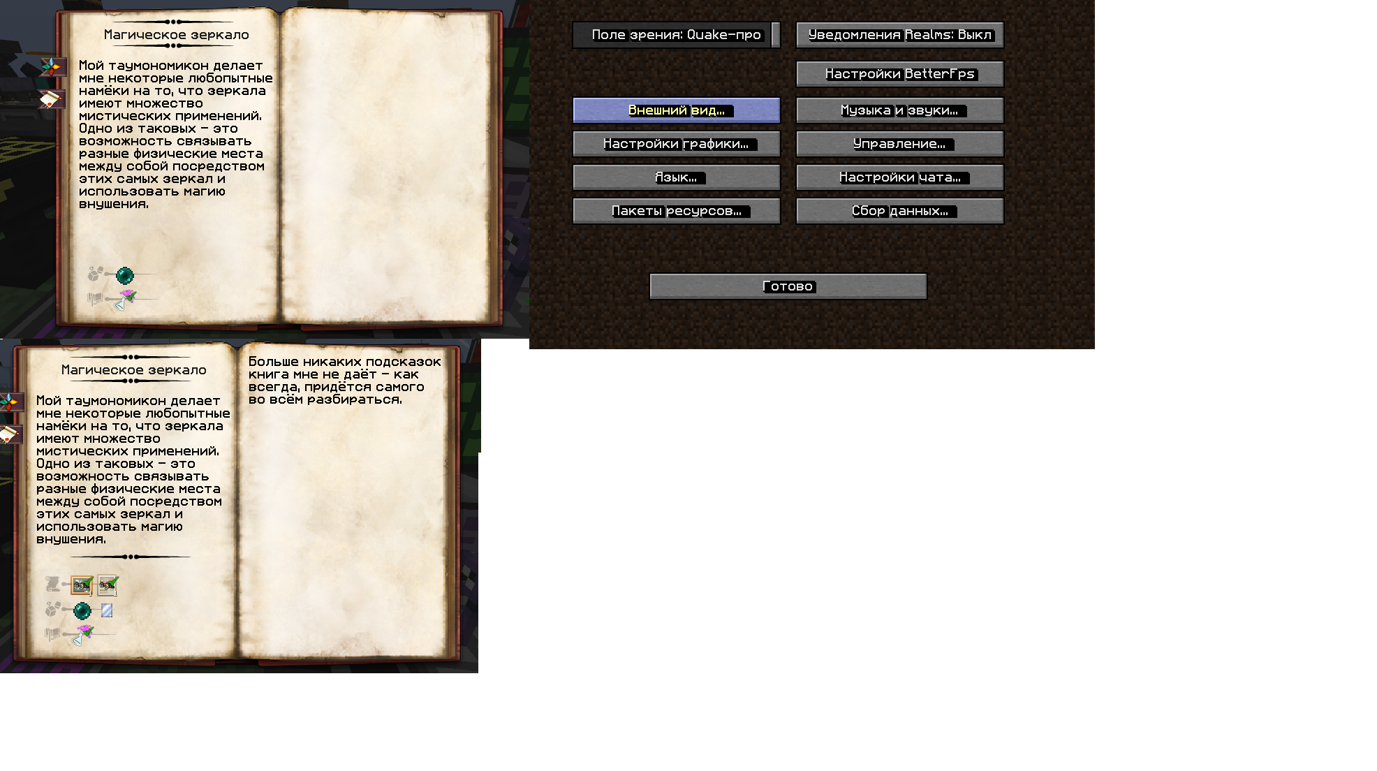 - Интересующий вас вопрос:Почему у меня чёрные кнопки? Какой параметр за это отвечает? И когда я навожус в таумономиконе на то что нужно создать, оно просто пропадает Вот так выглядит просто когда смотрю